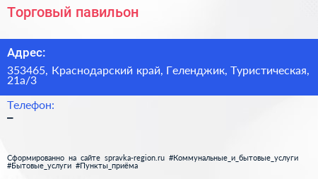 Торговый павильон по адресу 353465, Краснодарский край, Геленджик, Туристическая, 21а/3 в дальнейшем Организация, размещена в следующих категориях:
