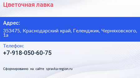 Цветочная лавка по адресу 353475, Краснодарский край, Геленджик, Черняховского, 1а в дальнейшем Организация, размещена в следующих категориях:
