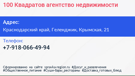 100 Квадратов, агентство недвижимости по адресу Краснодарский край, Геленджик, Крымская, 21 в дальнейшем Организация, размещена в следующих категориях: