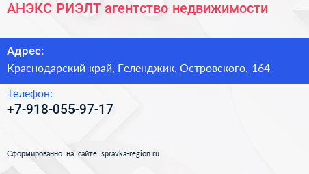 АНЭКС-РИЭЛТ, агентство недвижимости по адресу Краснодарский край, Геленджик, Островского, 164 в дальнейшем Организация, размещена в следующих категориях: