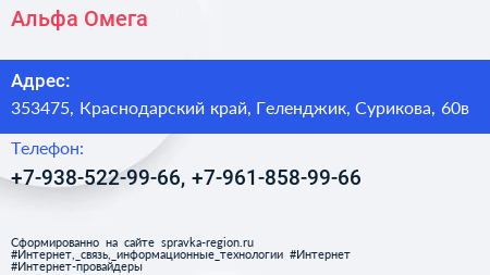 Альфа-Омега по адресу 353475, Краснодарский край, Геленджик, Сурикова, 60в в дальнейшем Организация, размещена в следующих категориях:
