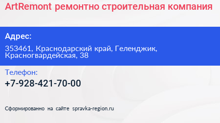 ArtRemont, ремонтно-строительная компания по адресу 353461, Краснодарский край, Геленджик, Красногвардейская, 38 в дальнейшем Организация, размещена в следующих категориях: