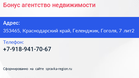 Бонус, агентство недвижимости по адресу 353465, Краснодарский край, Геленджик, Гоголя, 7 лит2 в дальнейшем Организация, размещена в следующих категориях: