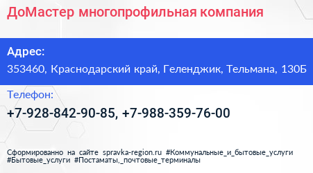 ДоМастер, многопрофильная компания по адресу 353460, Краснодарский край, Геленджик, Тельмана, 130Б в дальнейшем Организация, размещена в следующих категориях: