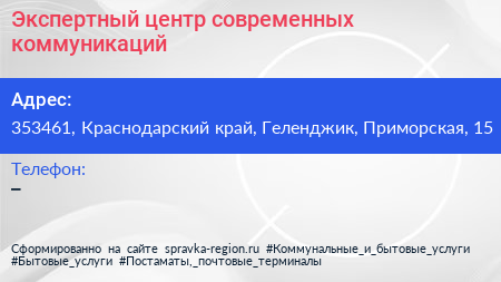 Экспертный центр современных коммуникаций по адресу 353461, Краснодарский край, Геленджик, Приморская, 15 в дальнейшем Организация, размещена в следующих категориях: