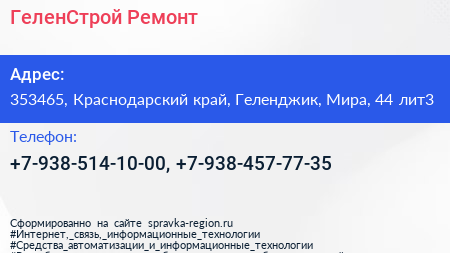 ГеленСтрой Ремонт по адресу 353465, Краснодарский край, Геленджик, Мира, 44 лит3 в дальнейшем Организация, размещена в следующих категориях: