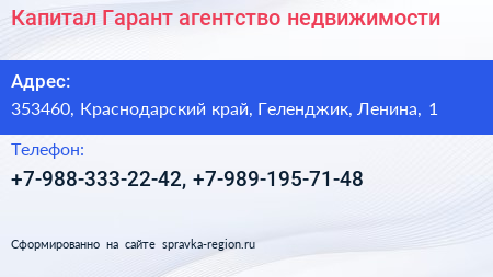 Капитал Гарант, агентство недвижимости по адресу 353460, Краснодарский край, Геленджик, Ленина, 1 в дальнейшем Организация, размещена в следующих категориях: