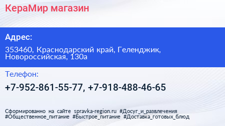 КераМир, магазин по адресу 353460, Краснодарский край, Геленджик, Новороссийская, 130а в дальнейшем Организация, размещена в следующих категориях: