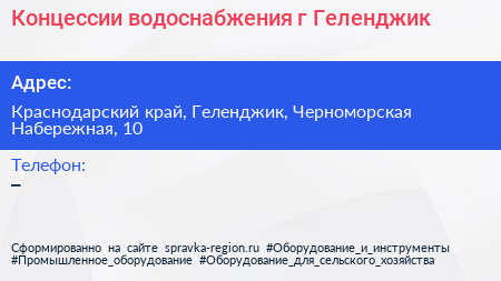 Концессии водоснабжения, г. Геленджик по адресу Краснодарский край, Геленджик, Черноморская Набережная, 10 в дальнейшем Организация, размещена в следующих категориях: