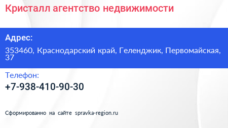 Кристалл, агентство недвижимости по адресу 353460, Краснодарский край, Геленджик, Первомайская, 37 в дальнейшем Организация, размещена в следующих категориях: