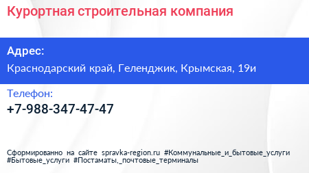 Курортная строительная компания по адресу Краснодарский край, Геленджик, Крымская, 19и в дальнейшем Организация, размещена в следующих категориях: