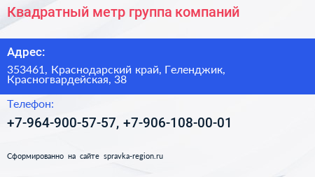 Квадратный метр, группа компаний по адресу 353461, Краснодарский край, Геленджик, Красногвардейская, 38 в дальнейшем Организация, размещена в следующих категориях: