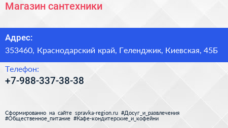 Магазин сантехники по адресу 353460, Краснодарский край, Геленджик, Киевская, 45Б в дальнейшем Организация, размещена в следующих категориях: