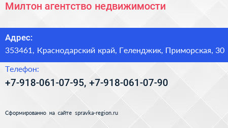 Милтон, агентство недвижимости по адресу 353461, Краснодарский край, Геленджик, Приморская, 30 в дальнейшем Организация, размещена в следующих категориях: