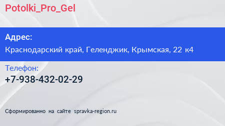 Potolki_Pro_Gel по адресу Краснодарский край, Геленджик, Крымская, 22 к4 в дальнейшем Организация, размещена в следующих категориях: