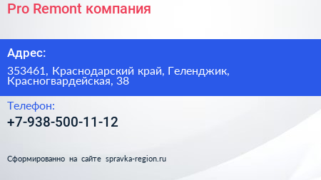 Pro.Remont, компания по адресу 353461, Краснодарский край, Геленджик, Красногвардейская, 38 в дальнейшем Организация, размещена в следующих категориях: