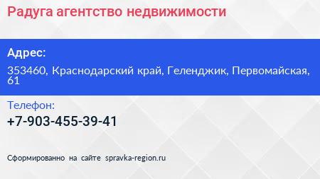 Радуга, агентство недвижимости по адресу 353460, Краснодарский край, Геленджик, Первомайская, 61 в дальнейшем Организация, размещена в следующих категориях: