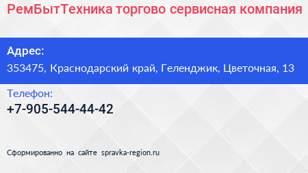 РемБытТехника, торгово-сервисная компания по адресу 353475, Краснодарский край, Геленджик, Цветочная, 13 в дальнейшем Организация, размещена в следующих категориях: