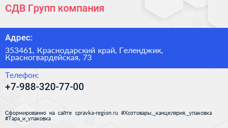 СДВ Групп , компания по адресу 353461, Краснодарский край, Геленджик, Красногвардейская, 73 в дальнейшем Организация, размещена в следующих категориях: