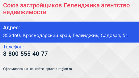 Союз застройщиков Геленджика, агентство недвижимости по адресу 353460, Краснодарский край, Геленджик, Садовая, 51 в дальнейшем Организация, размещена в следующих категориях:
