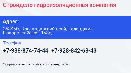 Стройдело, гидроизоляционная компания по адресу 353460, Краснодарский край, Геленджик, Новороссийская, 163д в дальнейшем Организация, размещена в следующих категориях: