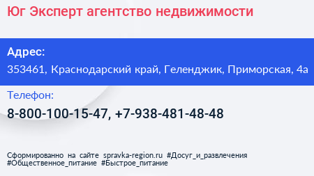 Юг-Эксперт, агентство недвижимости по адресу 353461, Краснодарский край, Геленджик, Приморская, 4а в дальнейшем Организация, размещена в следующих категориях: