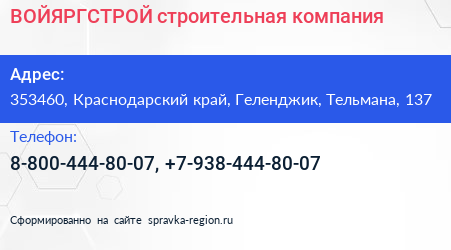 ВОЙЯРГСТРОЙ, строительная компания по адресу 353460, Краснодарский край, Геленджик, Тельмана, 137 в дальнейшем Организация, размещена в следующих категориях: