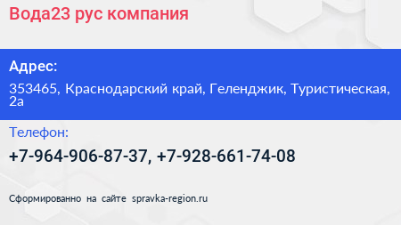 Вода23.рус, компания по адресу 353465, Краснодарский край, Геленджик, Туристическая, 2а в дальнейшем Организация, размещена в следующих категориях: