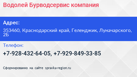 Водолей-Бурводсервис, компания по адресу 353460, Краснодарский край, Геленджик, Луначарского, 2Б в дальнейшем Организация, размещена в следующих категориях: