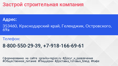 Застрой, строительная компания по адресу 353460, Краснодарский край, Геленджик, Островского, 69а в дальнейшем Организация, размещена в следующих категориях: