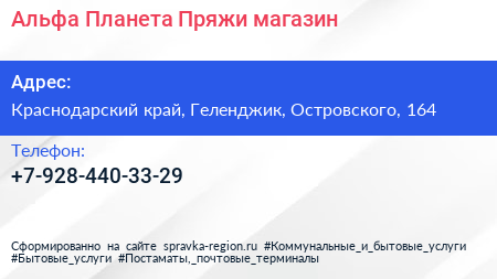 Альфа Планета Пряжи, магазин по адресу Краснодарский край, Геленджик, Островского, 164 в дальнейшем Организация, размещена в следующих категориях:
