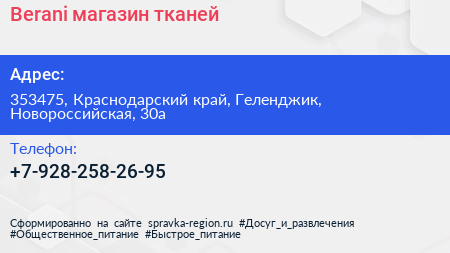 Berani, магазин тканей по адресу 353475, Краснодарский край, Геленджик, Новороссийская, 30а в дальнейшем Организация, размещена в следующих категориях: