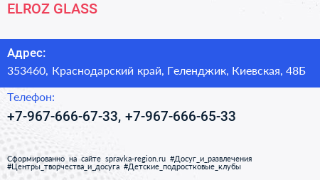 ELROZ GLASS по адресу 353460, Краснодарский край, Геленджик, Киевская, 48Б в дальнейшем Организация, размещена в следующих категориях: