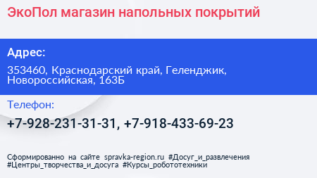 ЭкоПол, магазин напольных покрытий по адресу 353460, Краснодарский край, Геленджик, Новороссийская, 163Б в дальнейшем Организация, размещена в следующих категориях: