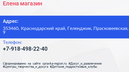 Елена, магазин по адресу 353460, Краснодарский край, Геленджик, Прасковеевская, 9 в дальнейшем Организация, размещена в следующих категориях: