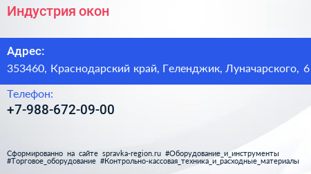 Индустрия окон по адресу 353460, Краснодарский край, Геленджик, Луначарского, 6 в дальнейшем Организация, размещена в следующих категориях: