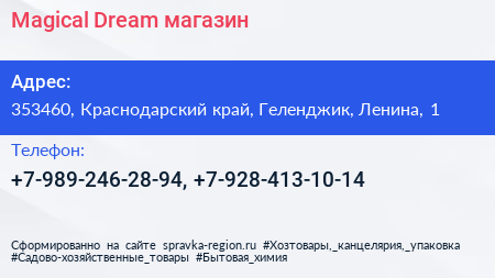 Magical Dream, магазин по адресу 353460, Краснодарский край, Геленджик, Ленина, 1 в дальнейшем Организация, размещена в следующих категориях: