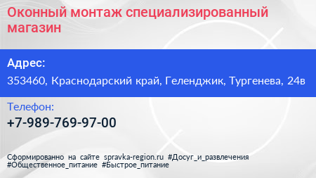 Оконный монтаж, специализированный магазин по адресу 353460, Краснодарский край, Геленджик, Тургенева, 24в в дальнейшем Организация, размещена в следующих категориях: