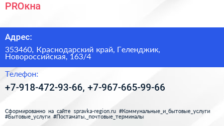 PROкна по адресу 353460, Краснодарский край, Геленджик, Новороссийская, 163/4 в дальнейшем Организация, размещена в следующих категориях: