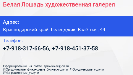 Белая Лошадь, художественная галерея по адресу Краснодарский край, Геленджик, Взлётная, 44 в дальнейшем Организация, размещена в следующих категориях: