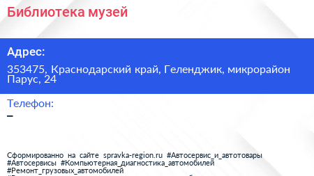 Библиотека-музей по адресу 353475, Краснодарский край, Геленджик, микрорайон Парус, 24 в дальнейшем Организация, размещена в следующих категориях: