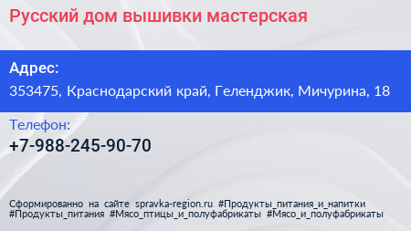 Русский дом вышивки, мастерская по адресу 353475, Краснодарский край, Геленджик, Мичурина, 18 в дальнейшем Организация, размещена в следующих категориях: