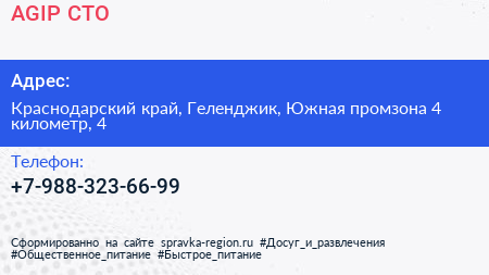 AGIP, СТО по адресу Краснодарский край, Геленджик, Южная промзона 4 километр, 4 в дальнейшем Организация, размещена в следующих категориях: