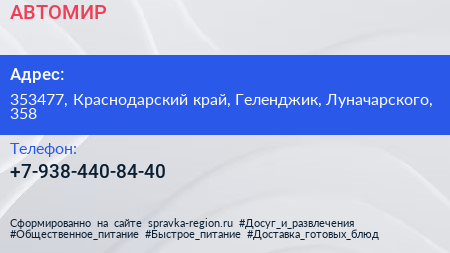 АВТОМИР+ по адресу 353477, Краснодарский край, Геленджик, Луначарского, 358 в дальнейшем Организация, размещена в следующих категориях: