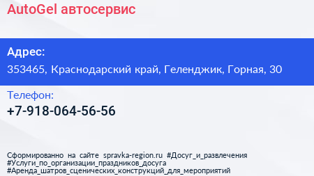 AutoGel, автосервис по адресу 353465, Краснодарский край, Геленджик, Горная, 30 в дальнейшем Организация, размещена в следующих категориях: