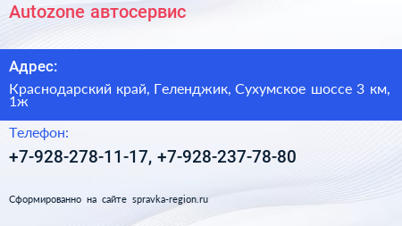 Autozone, автосервис по адресу Краснодарский край, Геленджик, Сухумское шоссе 3 км, 1ж в дальнейшем Организация, размещена в следующих категориях: