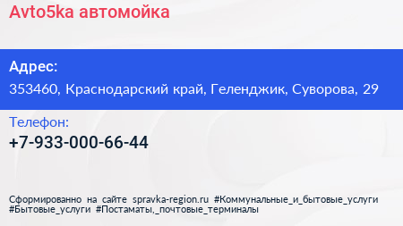 Avto5ka, автомойка по адресу 353460, Краснодарский край, Геленджик, Суворова, 29 в дальнейшем Организация, размещена в следующих категориях: