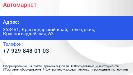 Автомаркет по адресу 353461, Краснодарский край, Геленджик, Красногвардейская, 63 в дальнейшем Организация, размещена в следующих категориях: