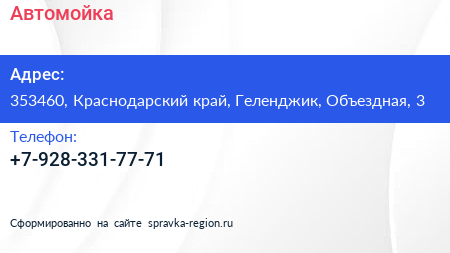Автомойка по адресу 353460, Краснодарский край, Геленджик, Объездная, 3 в дальнейшем Организация, размещена в следующих категориях: