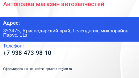 Автополка, магазин автозапчастей по адресу 353475, Краснодарский край, Геленджик, микрорайон Парус, 11а в дальнейшем Организация, размещена в следующих категориях: